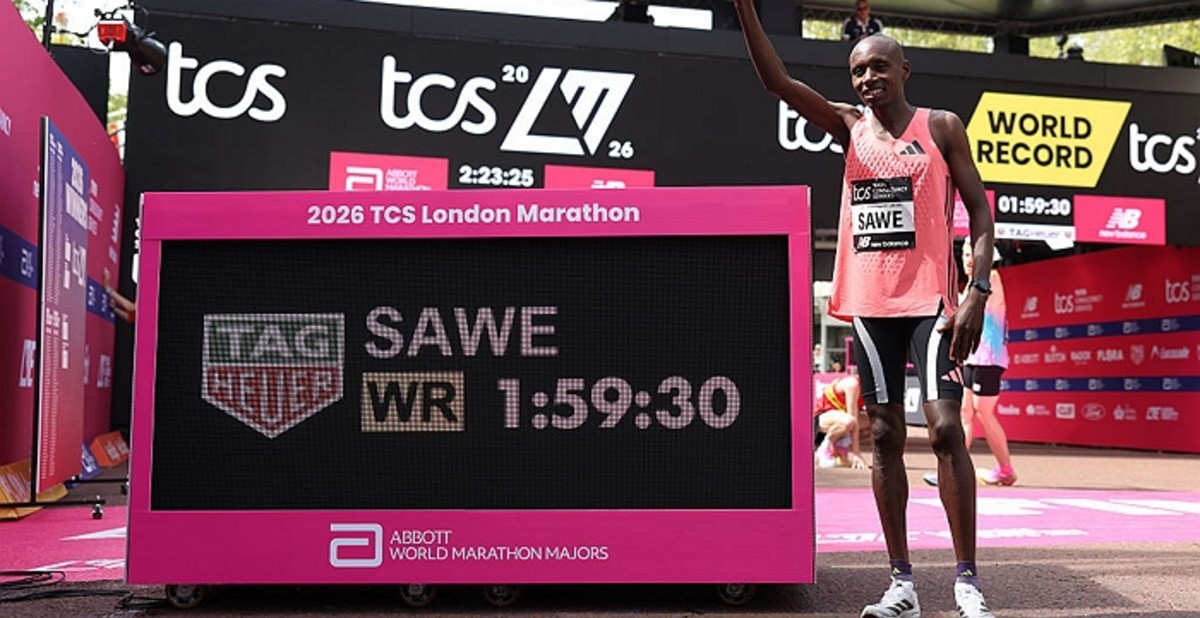 사바스티안 사웨가 2026 런던 마라톤에서 1시간 59분 30초를 기록하며 사상 첫 공식 서브 2를 달성했다.