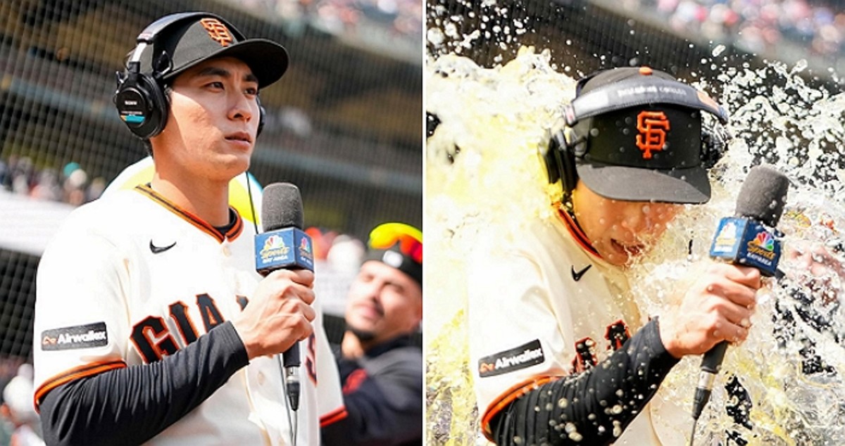 팀 동료 윌리 아다메스가 더그아웃에서 음료 통을 가져와 몰래 접근한 뒤 이정후에게 노란색 이온 음료를 쏟아부었다.
