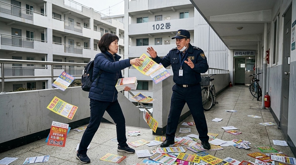 전단지를 붙이던 여성을 제지하는 과정에서 가방을 잡았다가 폭행 혐의로 기소된 아파트 경비원이 법원에서 무죄 판결을 받았다. 재판부는 경비원의 행위를 위법한 공격으로부터 자신을 보호하기 위한 '정당방위'로 판단했다.