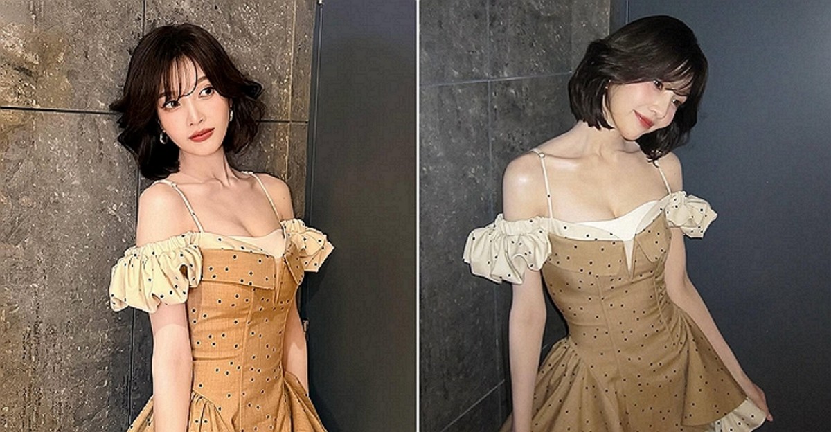 공개된 사진 속 조이는 도트 무늬가 가미된 브라운 톤의 미니 드레스를 입고 다채로운 포즈를 취하고 있다.