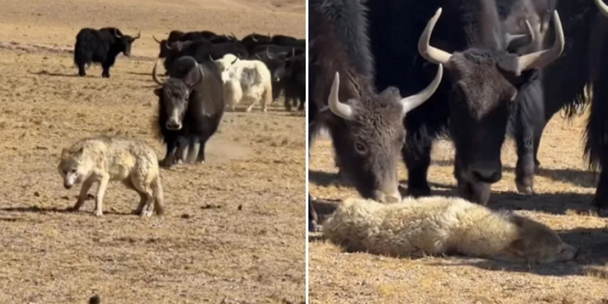 영상 속 상황은 처절했다. 야크 떼로부터 불과 50m 떨어진 곳에 서 있던 늑대 한 마리에게 거대한 야크가 전력 질주해 들이받았다.