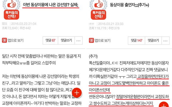 지난 23일 한 온라인 커뮤니티에서는 '동상이몽에 출연한 여고생의 실체' '우리 학교 일진 동상이몽 나옴'이라는 제목의 글들이 속속 올라오고 있다.