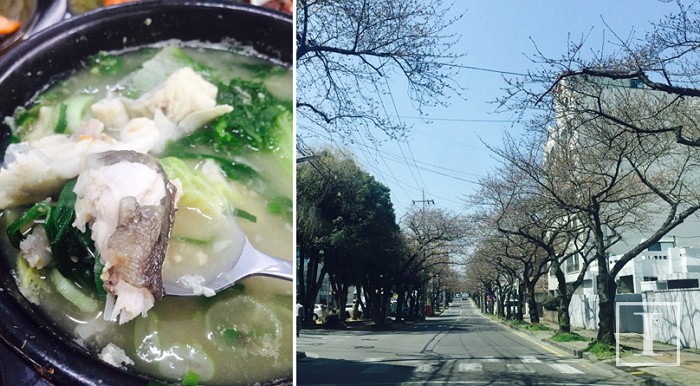 (좌)'삼도정'에서 먹은 아나고 된장지리, (우) 벚꽃나무가 이어진 전농로