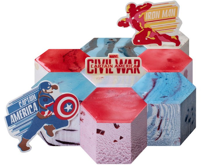'히어로즈 케이크'는 캡틴아메리카와 아이언맨의 대결구도를 그린 영화 '캡틴아메리카:시빌 워'를 콘셉트로 캡틴아메리카를 상징하는 블루, 아이언맨을 상징하는 레드가 잘 반영된 것이 특징이다.