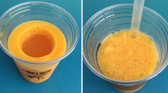 이 구멍 안에 뜨거운 물을 붓기만 하면 꽁꽁 언 내용물이 곱게 갈린 알갱이들이 돼 곧 스무디로 변한다.