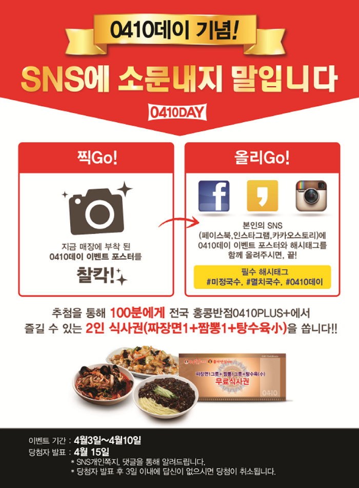 더본 코리아 마케팅부 관계자는 인사이트에 "매장 내 반값 포스터를 찍어 개인 SNS에 올린 고객들 가운데 100명을 추첨해 홍콩반점0410PLUS+ 2인식사권(짜장면1+짬뽕1+탕수육 小)을 증정한다"고 전했다.