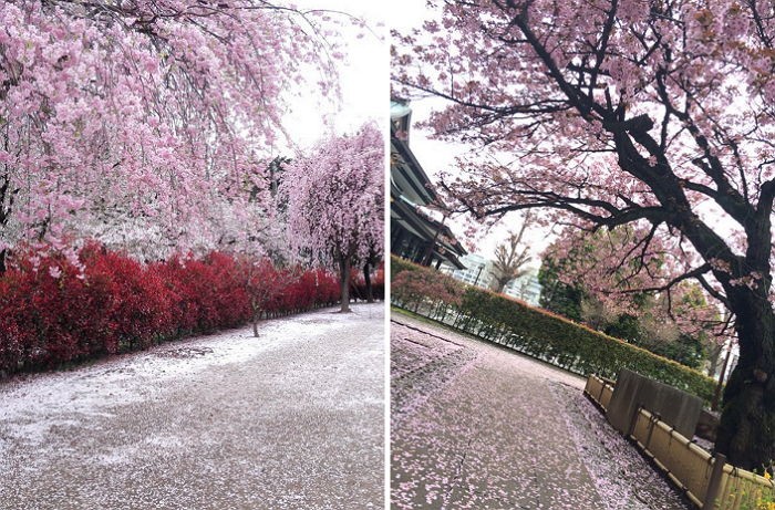 공개된 사진은 일본에서 포착된 것으로 수많은 벚꽃잎이 강이나 길 위에 잔뜩 쌓여 아찔할 정도로 아름다운 장관을 펼치고 있다.