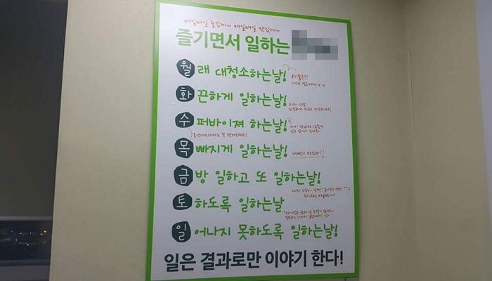 특히 '화요일은 화끈하게 일하는 날', '목요일에는 목 빠지게 일하는 날', '토요일은 토하도록 일하는 날'이라며 '일은 결과로만 이야기한다'는 다소 냉혹한 말들도 이어졌다.