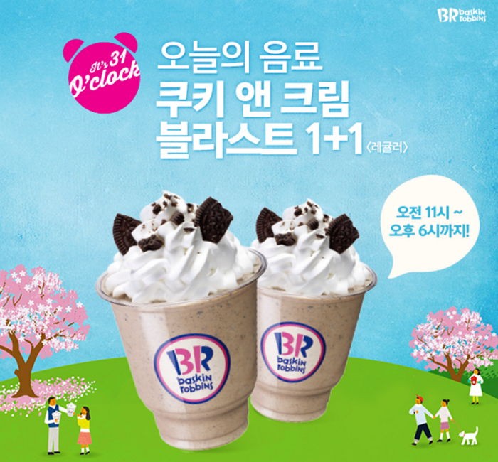 [인사이트] 정정화 기자 = 오늘(13일) 베스킨라빈스에서 쿠키앤크림 블라스트 한 잔을 구입하면 한 잔을 추가로 받을 수 있다.