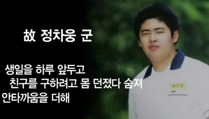 세월호 침몰 당시 고(故) 정차웅 군은 반 친구에게 자신의 구명조끼를 건네고, 다른 친구를 구하러 가다 숨지고 말았다.