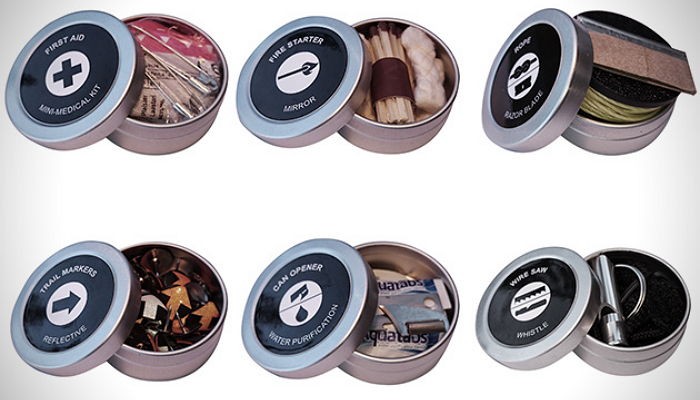 이 생존키트에는 기본적인 LED 손전등과 나침반, 정수 태블릿, 거울, 응급처치 도구 등과 로프, 파이어 스타터, 각종 칼, 톱, 호루라기 등이 들어있다.