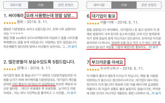 12일 카메라 앱 서비스 '싸이메라'에는 베끼기 논란에 대해 비판하는 사용자들의 리뷰 글들이 잇달아 올라오고 있다.