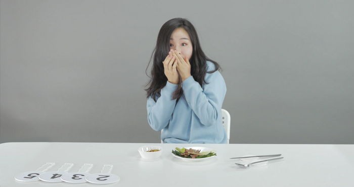 영상 제작자는 5명의 남녀 참가자에게 주어진 음식을 먹어보고 어느 나라 음식일 것 같은지 맞춰보라고 지시한 후 음식 재료를 확인하도록 했다.