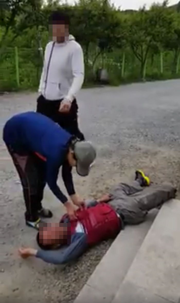 아들과 이 여성은 입에 담기 어려운 욕설을 내뱉으면서 폭행을 계속했고 나이든 남성은 폭행의 충격 때문에 정신을 잃은 듯 길바닥에서 꼼짝도 못하고 있다.