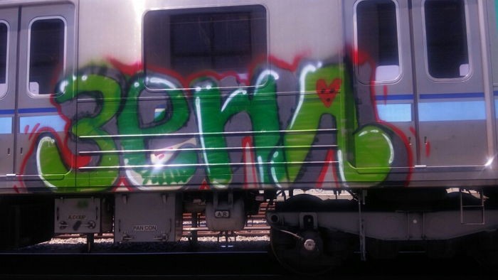 사진 속 전동차 바깥에는 스프레이로 'X-mas', '3enA'라고 크게 쓰여 있다.