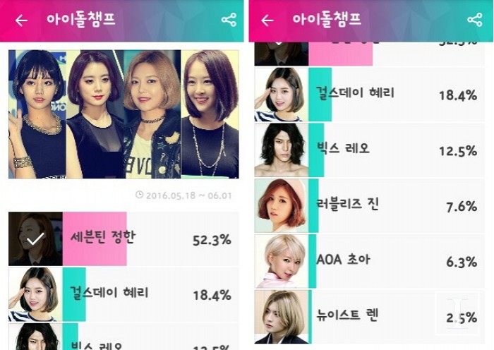 현재까지 집계된 결과에 따르면 남자 아이돌인 '세븐틴' 정한이 과반수를 웃도는 52.3%로 '단발이 잘어울리는 아이돌'이라는 타이틀을 거머쥐었다.