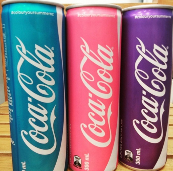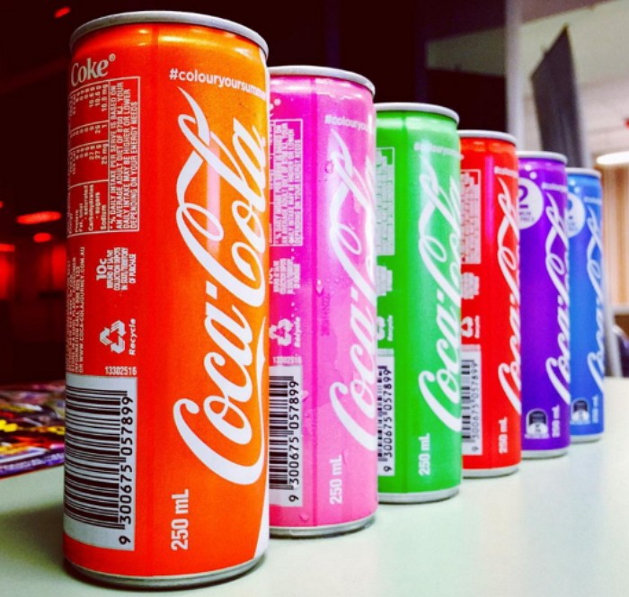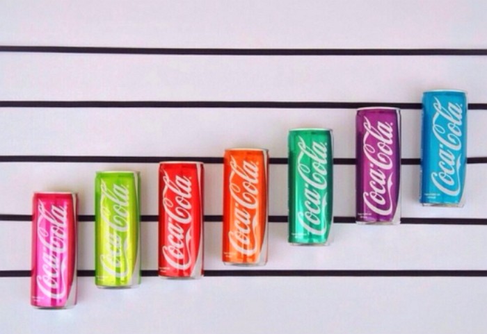 사진 속에는 기본인 빨간색부터 주황색, 분홍색, 파란색, 연두색, 보라색 등 비비드 한 색상으로 변모한 코카콜라 캔의 모습이 담겨있다.