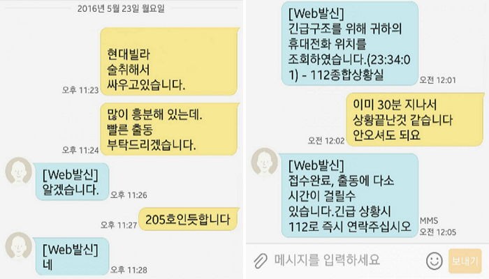 좌측은 기사와 관련 없는 자료 사진, 우측은 경찰과의 문자메시지 / (좌) 연합뉴스, (우) 온라인 커뮤니티