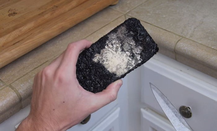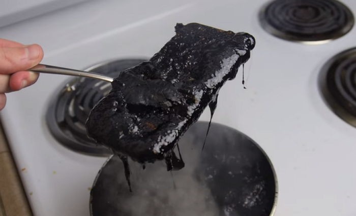 약 2분의 시간이 흐른 뒤, 실험맨은 검은색 찐득한 물체로 뒤덮인 아이폰을 꺼냈고 부엌 천장엔 하얀 연기가 발생하기도 했다.