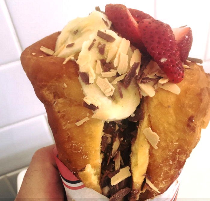 텔라밥은 부드러운 빵 사이에 신선한 딸기, 바나나 등 여러 가지 과일과 초콜릿 부스러기, 그리고 가장 중요한 누텔라를 넣어 만든다.