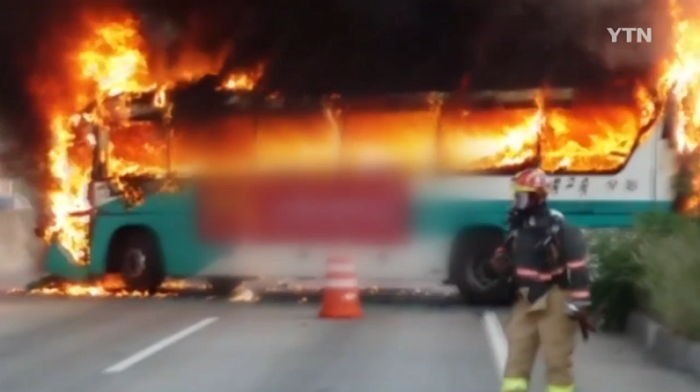 승객들이 모두 빠져 나간 뒤 불길이 더욱 치솟은 버스 / YTN 뉴스 화면 캡처