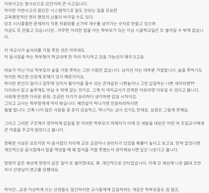 이어 그는 "여교사가 술자리를 거절 못한 것은 해당 학부형이 학교 내에서 한 자리를 차지하고 있을 가능성이 매우 크다"며 "본인 업무에 불이익을 줄 수 있는 꼰대같은 나쁜놈이라면 술을 못해도 마실 수 밖에 없었을 것이다"고 덧붙였다.
