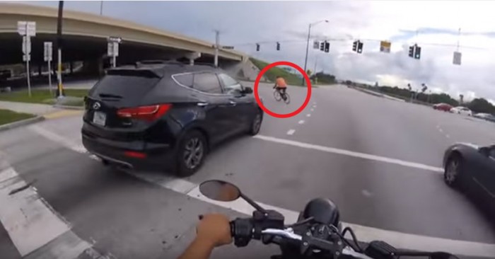 한 운전자가 신호를 기다리다가 파란불을 받고 천천히 출발한다. 그런데 어딘가에서 갑자기 나타난 자전거가 도로에 난폭하게 끼어든다.