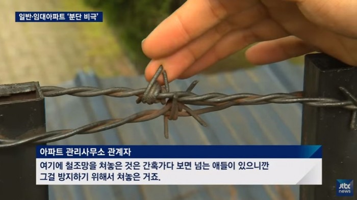 8일 JTBC 뉴스는 분양-임대 아파트 단지내 '철조망'이 논란을 일으키고 있다고 보도했다.