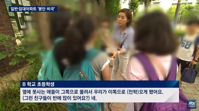 실제로 분양 아파트에 사는 어린이들은 임대 아파트에 사는 학생들과 어울리는 것을 꺼려하기 때문이다.