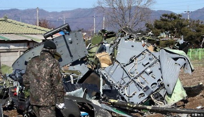 헬기가 추락한 곳은 춘천 항공대 인근의 밭으로 사고 헬기는 완전히 부서진 것으로 알려졌다.