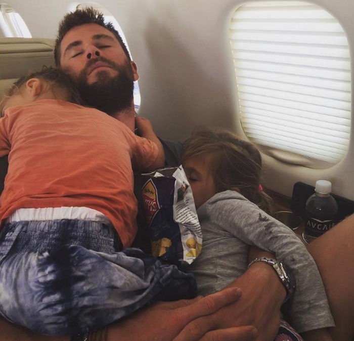 사진 속 크리스 햄스워스는 자신의 넓은 품에 쏙 들어오는 두 아이와 비행기 안에서 달콤한 낮잠을 즐기고 있다.